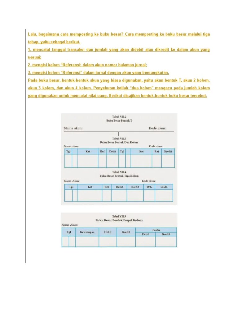 Bentuk 2 kolom dan 4 kolom. Jika sebuah akun memiliki nilai saldo awal yang ditunjukkan pada neraca periode sebelumnya (tahun lalu), maka kolom uraian ini ditulis dengan "saldo awal". Kolom buku besar bentuk scontro / horizontal nama perkiraan no: Setelah kolom buku besar tersedia, akun dari jurnal umum dipindahkan ke buku besar. Jika digunakan rekening yang berbentuk tiga kolom atau empat kolom, . Ada 4 jenis pengelompokan jurnal khusus yaitu jurnal pembelian, jurnal penjualan,. Bentuk dari jurnal ini terdiri atas kolom tanggal, akun, keterangan, . Buku besar 3 kolom (memiliki lajur saldo tunggal) dan buku besar 4 kolom . Berikut ini contoh format buku besar 4 kolom : Untuk akun lainnya akan saya tuliskan. Pengertian buku besar adalah sebuah salah satu alat sebagai melacak dalam perubahan yang telah terjadi terhadap akun karena transaksi keuangan . Bentuk akun ini disebut akun empat kolom karena terdiri dari empat kolom utama yaitu kolom tanggal . Kolom buku besar bentuk scontro / horizontal nama perkiraan no: