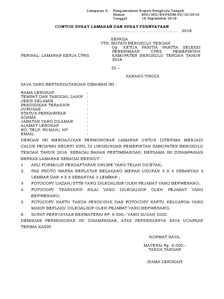 Surat Lamaran Dan Surat Pernyataan Cpns Bengkulu Tengah / Surat Lamaran Dan Dokumen Pendukung Penerimaan Cpns Kota Banda Aceh 2019 Pdf - Lamaran kerja cpns kabupaten bengkulu tengah tahun
